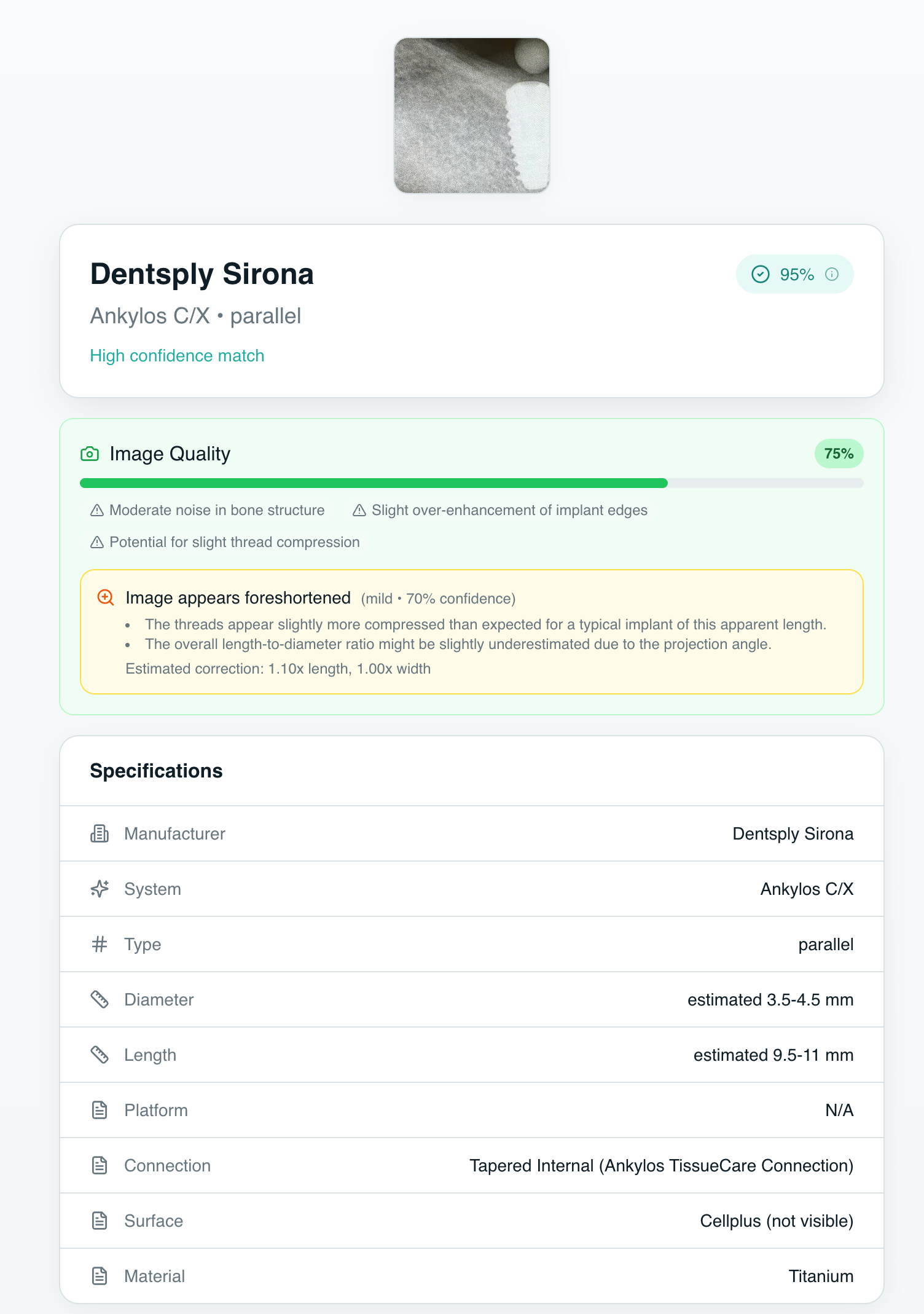 Upload a unidentified implant radiograph, or clinical photo, to get likely system matches, manufacturer details, and platform insights—so you can choose compatible components and keep treatment moving.